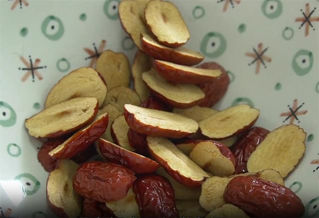 3.糯米快蒸好的时候准备一些大枣,洗干净以后切成片,剩下的枣核我一般拿来泡水喝,很适合女性朋友,全部切好后放入碗中。