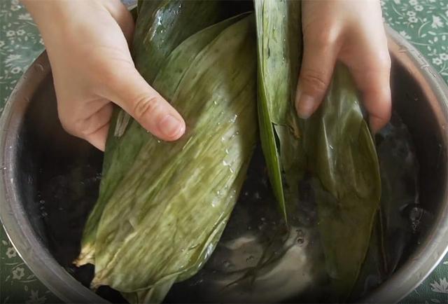 10.现在就已经闻着特别香了,蒸好以后先取出来放凉,然后倒扣在盘子里,如果喜欢吃冰冰凉凉的,可以放入冰箱冷藏2个小时,再把粽叶轻轻揭下来。