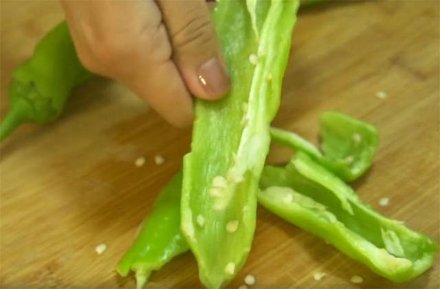 6.再准备几个青椒去籽,不需要用刀切,直接撕成大块备用。