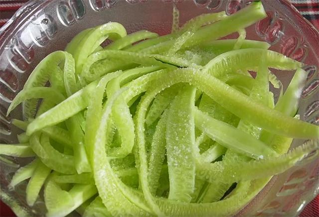 4.腌好的黄瓜颜色翠绿翠绿的,里面杀出很多水分,用力把黄瓜的水分挤掉,然后放在通风处晾干,只需要晾干表面的水分,不要把黄瓜晾到干瘪的状态,这样经过晾晒以后的黄瓜吃起来口感更脆而且更入味。
