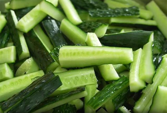 1.秋天吃饭没胃口,我会经常用黄瓜来做开胃小菜,今天一大早又买了五斤,先用流水冲洗干净,再把头和尾去掉,然后对半切开,把黄瓜分成4份,把中间的瓤取下来,这样做出来的黄瓜特别爽脆,再切成5厘米左右的段,全部放入盆里。