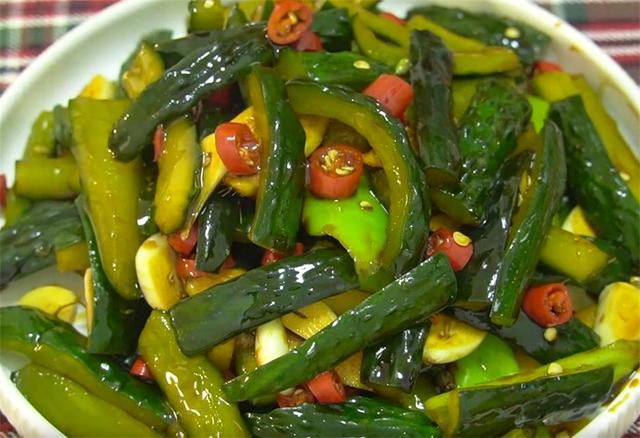 准备食材: 黄瓜、盐、大蒜、小米辣、生姜、青椒、酱油、香醋、冰糖、花椒、八角、香油 具体做法: