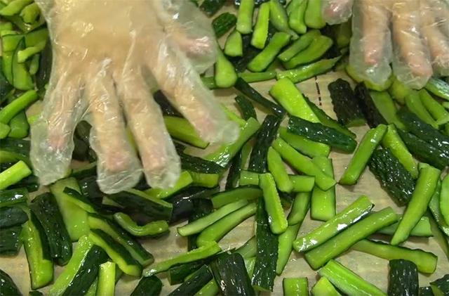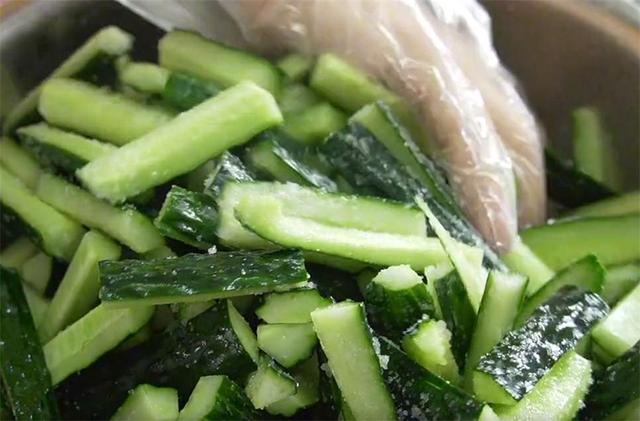 3.五斤黄瓜放入60克盐,用手抓拌均匀,盖上盖子把黄瓜腌制3个小时。