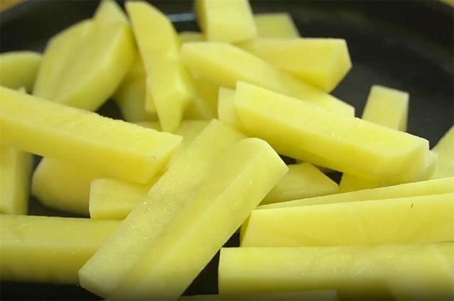 3.去皮的土豆切成厚片,再切成条,先放碗里备用。