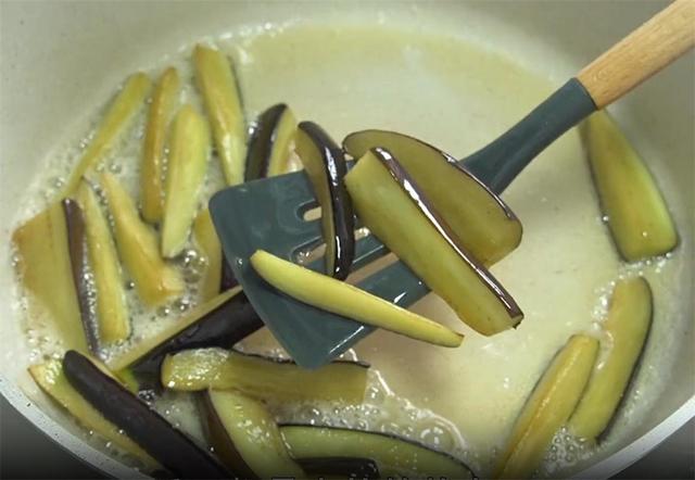 2.很多朋友做菜的时候喜欢去掉茄子皮,其实它的营养特别丰富,千万不要浪费,把茄子切成长段,再对半切开,切成条。