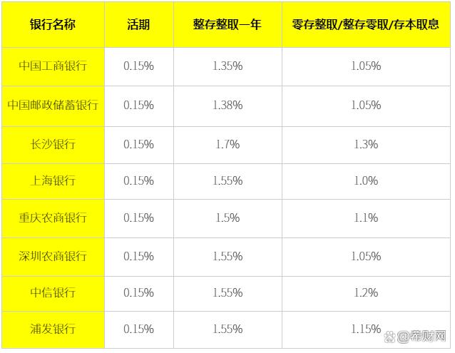 3、农商银行 重庆农商银行:活期利率0.15%,整存整取一年利率1.5%;零存整取、整存零取、存本取息一年利率1.1%。 5万元存活期一年,利息是:50000*0.15%=75元;整存整取一年,利息是:50000*1.5%=750元;零存整取、整存零取、存本取息一年的利息是:50000*1.1%=550元。 深圳农商银行:活期利率0.15%,整存整取一年利率1.55%;零存整取一年利率1.05%。 5万元存活期一年,利息是:50000*0.15%=75元;整存整取一年,利息是:50000*1.55%=775元;零存整取、整存零取、存本取息一年的利息是:50000*1.05%=525元。 4、商业银行 中信银行:活期利率0.15%,整存整取一年利率1.55%;零存整取、整存零取、存本取息一年利率1.2%。 5万元存活期一年,利息是:50000*0.2%=100元;整存整取一年,利息是:50000*1.55%=775元;零存整取、整存零取、存本取息一年的利息是:50000*1.2%=600元。 浦发银行:活期利率0.15%,整存整取一年利率1.55%;零存整取、整存零取一年利率1.15%。 5万元存活期一年,利息是:50000*0.15%=75元;整存整取一年,利息是:50000*1.55%=775元;零存整取、整存零取一年的利息是:50000*1.15%=575元。