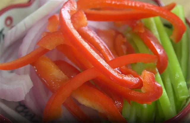 2.准备半个洋葱,切成条,洗干净的青红椒去籽以后切成丝备用。