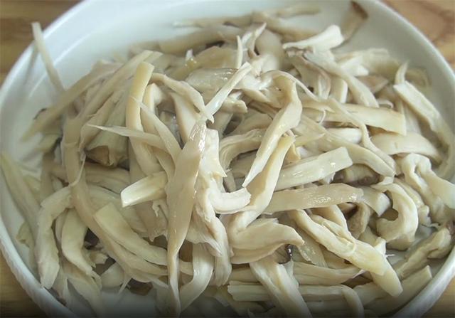 3.锅里水烧开,加一勺盐,把处理好的杏鲍菇下锅焯水三分钟就可以,然后全部捞出来过一下凉水,泡凉以后用力把水分挤干。
