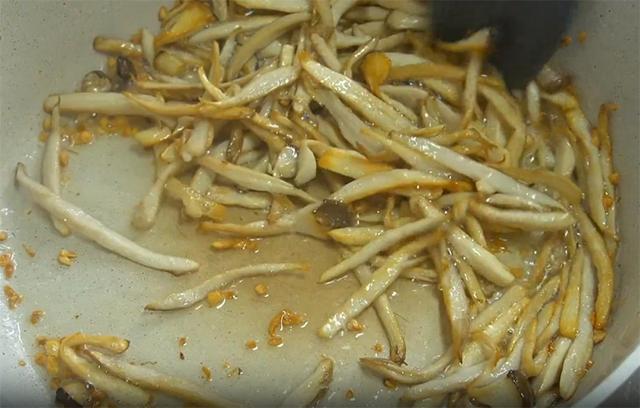 4.锅里放油,油热以后放上切好的蒜末,先把蒜香味炒出来,下入焯水过的杏鲍菇,把杏鲍菇翻炒一会儿,炒至表面颜色焦黄,像这样就可以。
