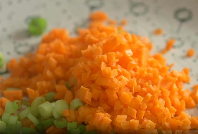 3.准备一点小葱,切成葱花,洗净的一根胡萝卜切片,再切成丝,最后切成胡萝卜丁。www.ws46.com