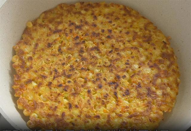5.平底锅刷油,油热以后把玉米粒糊倒进去,用铲子摊均匀,表面撒上一层芝麻,既好看还能增香,盖上盖子小火先烙三分钟,然后把饼子翻个面再烙三分钟左右,直到用铲子按压感觉有弹性就可以了。