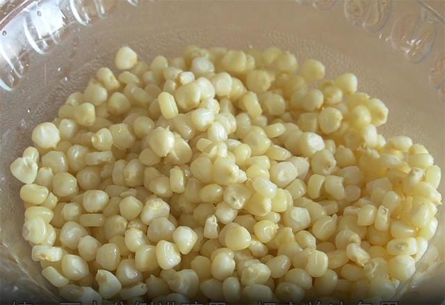 2.准备一锅开水,把剥好的玉米粒下锅,开大火煮两分钟左右,然后将煮好的玉米粒捞出,控一下水分,装进碗里,把它放凉备用。