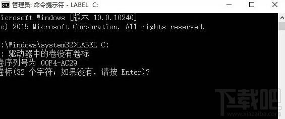 驱动器 C:中的卷是xxxxxxxx 卷序列号为xxxxx 卷标(32 个字符;如果没有,请按 Enter)? 4、当询问是否删除当前的卷标时按下Y键 ,随后按回车键,命令将清除C盘卷标,清除完成后再次尝试为C盘设定卷标。 |