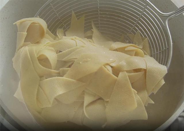 5.锅里水烧开,加一勺盐,把切好的豆皮全部下锅,焯水一分钟就可以,豆腐皮虽然可以直接吃,但是过一下热水能去除部分的豆腥味,然后捞出来控水备用。
