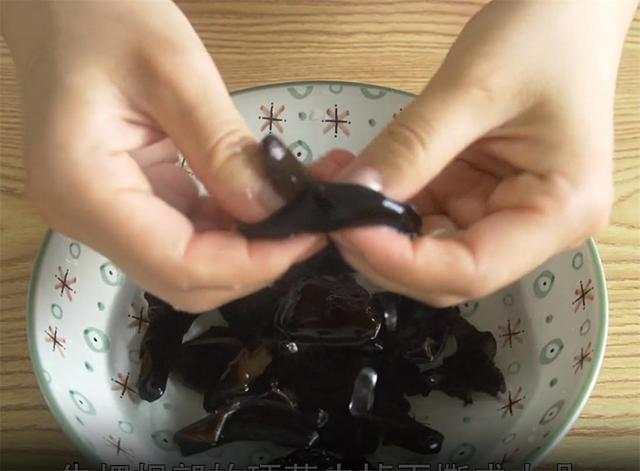 4.这些是提前泡发好的木耳,先把根部的硬蒂去掉,再撕成小朵。
