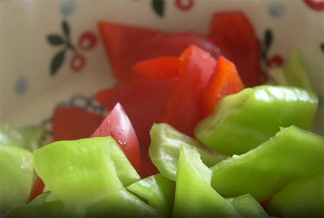 2.去籽的青红椒各一个,切成小段备用。