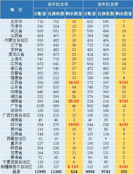 但对于看着龙年币钞太过火热,现在还想要去入手的藏友,百科网个人的建议,是要多多小心了,最好是不要去介入了。 二羊、泰山币,甚至更多纪念币和纪念钞,都曾经如此爆火过,但很少有长久能够维持的。 全国额度公布随着2次预约的陆续进行,全国各地的额度也发生了些许改变,还有不少藏友想要知道,当地还有多少额度可以预约。 百科网就给大家整理了一份额度表格,供大家进行参考。