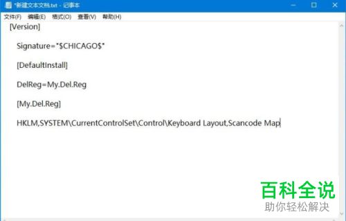 5. 方法二:双击或者右击打开记事本,接着复制粘贴以下内容: [Version] Signature=“$CHICAGO$” [DefaultInstall] DelReg=My.Del.Reg [My.Del.Reg] HKLM,SYSTEM\CurrentControlSet\Control\Keyboard Layout,Scancode Map