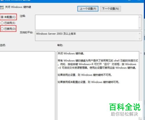 4. 第四步,我们可以看到如下图所示的关闭Windows键热键页面,点击未配置或者已禁用左边的选项框,接着点击右下角的确定选项。