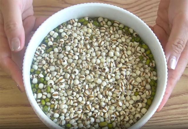 4.准备一个碗,把绿豆放进去,再倒入薏米,把它们铺均匀一些,倒入泡好的绿豆水,放在冰箱里面冷冻一个晚上,第二天一早就可以用了。