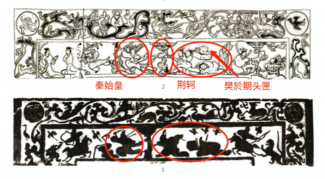 另外一幅画像石与前两幅在构图和细节上也非常相似,主要展现了“掷匕中柱”这一激动人心的瞬间。 史书中关于“荆轲刺秦”的描述可以在《史记·刺客列传》、《战国策·燕三》、《燕丹子》等文献中找到。概括来说,故事的主要人物有秦始皇、荆轲、秦舞阳和秦侍卫;主要道具包括燕国的“督亢图”、樊於期的头颅、秦始皇的长剑和荆轲的匕首;主要情节涉及“图穷匕见”、“王负剑”和“掷匕中柱”。