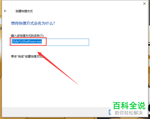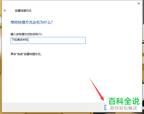 6. 然后我们就会进入到快捷方式命名的界面我们将这个快捷方式命名为下拉滑动关机,命名完成之后我们就可以点击窗口下方的完成
