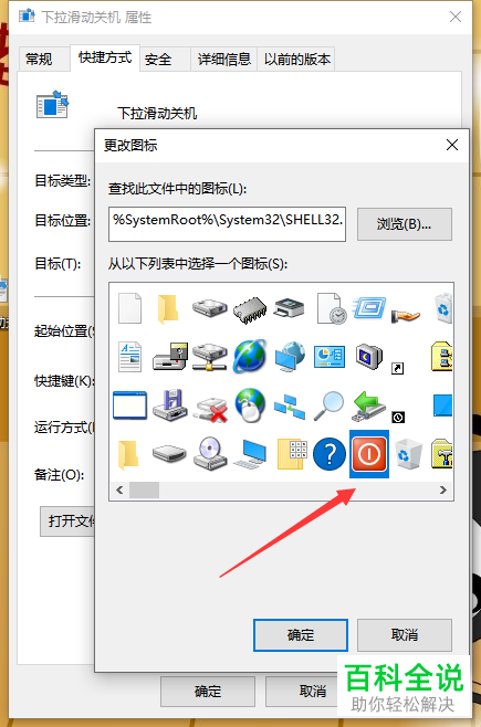 9. 然后就会进入到图标的菜单我们可以在所有的图标中找到关机的图标然后选择,选中之后就可以点击窗口下方的确定