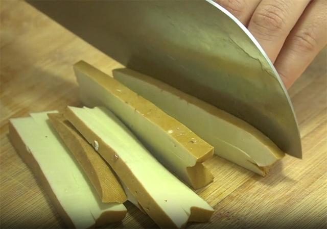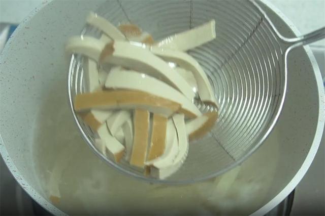 3.锅里水开,把香干放进去焯水60秒,焯水后的香干没有豆腥味,口感更佳,然后捞出来控水备用。
