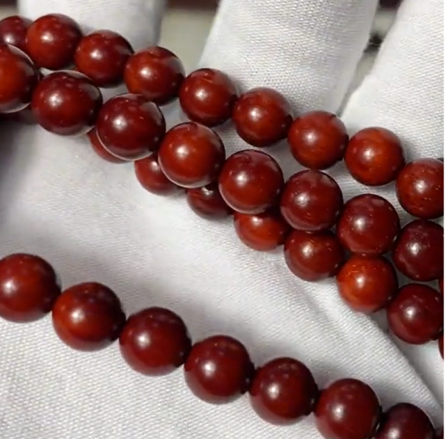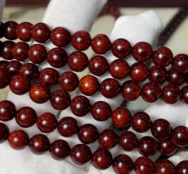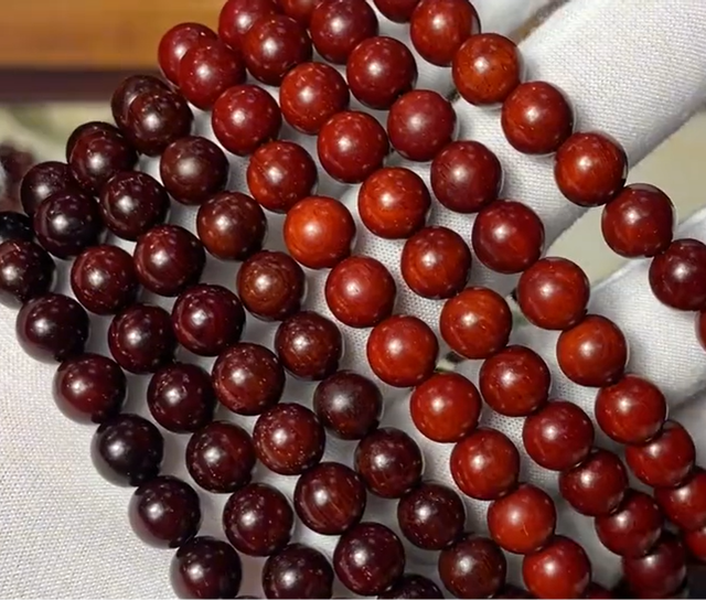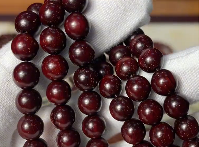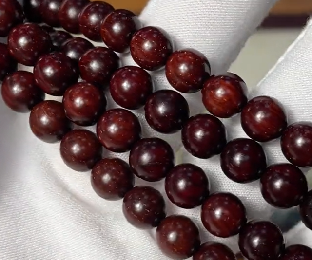先看第一个级别,这类紫檀佛珠,商家现在叫做火焰纹佛珠,看料子的油性和密度,市场价格一般在200-400之间,火焰纹其实就是黑筋,树木在生长过程中树皮开裂,氧气通过缝隙进入产生了部分氧化,出现了黑红相间的纹理,特别像火焰的感觉,商家就起了个好听的名字叫做火焰纹佛珠,火焰纹的优势就是观感上会更漂亮,不像纯色那么单调,而且带火焰纹的料子大部分都是野生林的老料,它的缺点就是不稳定,因为黑红相间会有这水分差,所以相对来说容易开裂,但是佛珠一般咱们正常去盘玩,开裂的风险是非常小的,所以放心入手问题不大。
