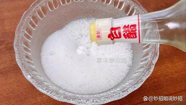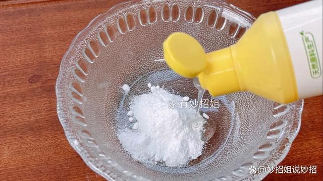 然后我们再往里面挤入一些洗洁精,洗洁精就有着超强的去油能力。洗洁精挤好,我们还需要往里面倒入一些白醋,白醋既可以帮助软化一些顽固的油污,它也有着除味的作用,可以有助于去除异味。