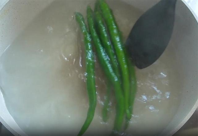 5.最后把线椒也放入锅中,同样焯水一分钟也捞出来控水。