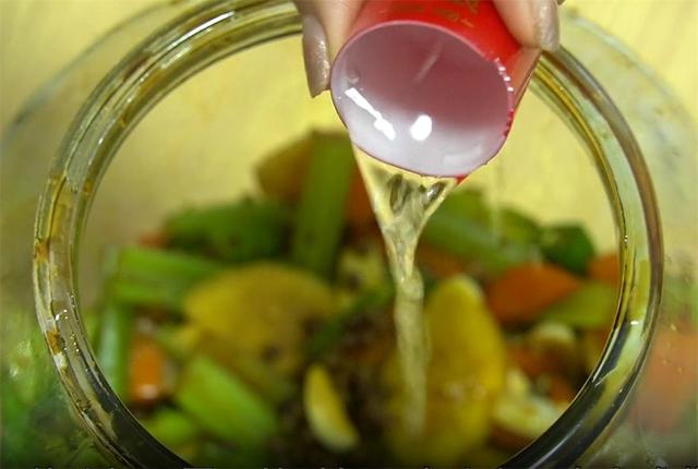 8.准备一个无水无油的干净瓶子,把所有的食材分次装进瓶子里,可以用手轻轻压一下,料汁也全部倒进来,加一瓶盖高度白酒,盖上盖子,第二天就可以吃啦,时间越久越入味。