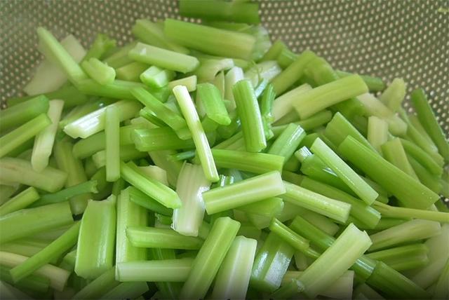 1.今天花八块钱买了五斤芹菜,咱们用它做个好吃的,先把芹菜叶子摘下来,叶子不要扔掉,留着做早餐饼或者烧汤都不错,再把芹菜根部切掉,然后用流水冲洗干净,再把芹菜从中间切开,这样比较容易入味,再切成小段,大约3厘米左右就可以,先装入大碗中备用。