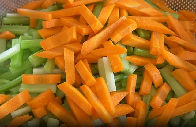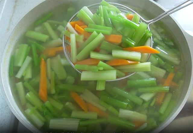 4.在锅里水烧开,加一勺盐,几滴食用油,把胡萝卜和芹菜下锅焯水一分钟就可以,不要太久,然后捞出来控水备用。