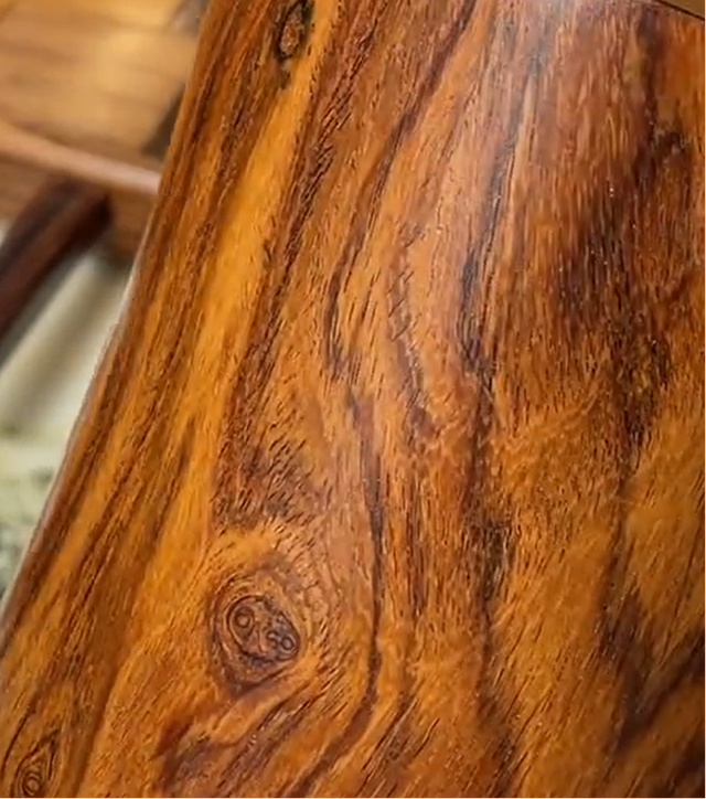 那为什么还会有很多朋友认为糠梨不值钱呢?两点,第一点是新料的原因,新料普遍底色会比较浅,商家会拿它来当糠梨老料卖,这样很多新玩家就会觉得油性和密度都很差,而且棕眼比较粗,纹理又比较发脏盘不出来。