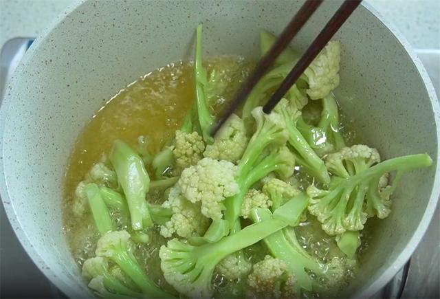 4.锅烧热放入食用油,可以多来点,油温六成倒入控干水分的花菜,先把花菜炸半分钟左右,这个花菜水分比较大,过油也不会吸油,所以加这一步吃起来一点不会油腻,然后捞出来控油备用。