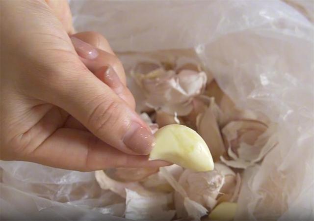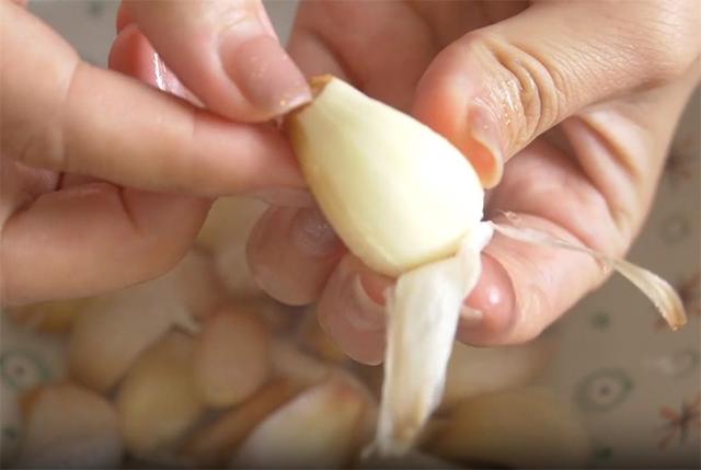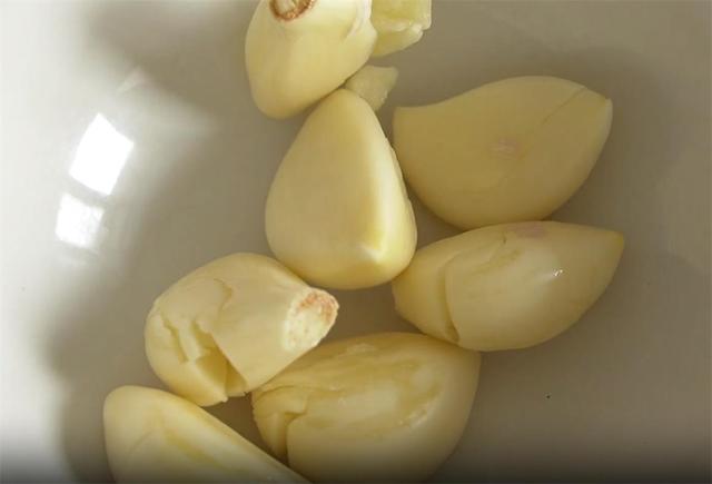 11.这样再去皮也是特别轻松的,而且大蒜非常完整,用完的也容易保存,如果时间充足的话,浸泡半个小时以后,基本上用手轻轻捏一下就可以去皮了。