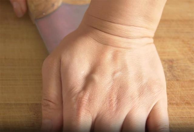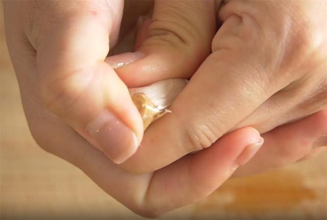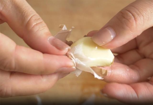 6.这时候蒜皮就会翘起来,可以转着圈捏几下,这样再去皮也是特别轻松的,这个方法也很适合少量用蒜的,压多了手指也会疼痛。