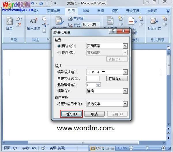 ②弹出脚注和尾注对话框,按照需要进行设置,然后单击插入按钮。