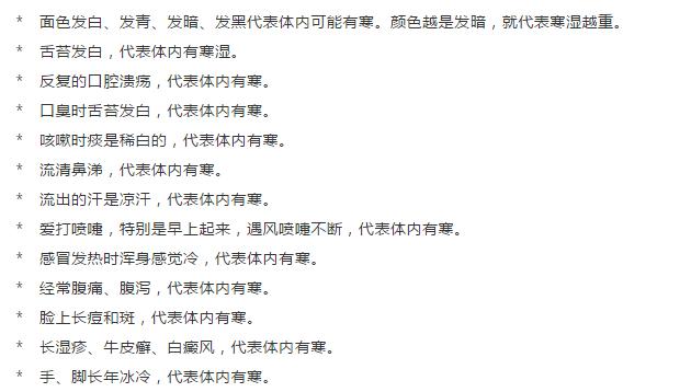 很多人秉承着“春捂秋冻”,殊不知,在这种寒气重的时节,冻着可是要耗损体内大部分阳气的,阳气不足,没有足够的动力推动气血、人就会变得懒懒的,且动不动就感冒打喷嚏。 若是您有下图这些情况发生,那就要想办法祛祛除体内的寒气了。