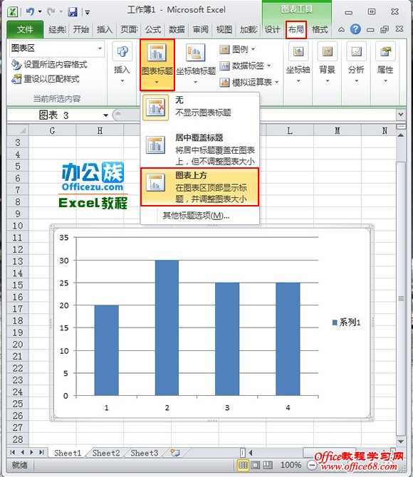 点击“图标工具”中的“布局”选项卡,然后在“标签”选项组中点击“图表标题”,在下拉菜单中选择“图表上方”选项。