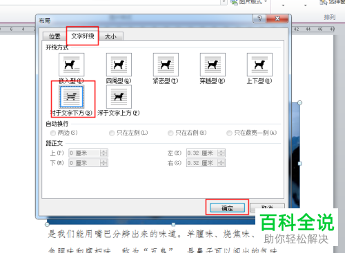 6.第六步,在弹出的布局窗口中,点击文字环绕选项,然后在下方选中衬衣于文字下方,再点击确定按钮。