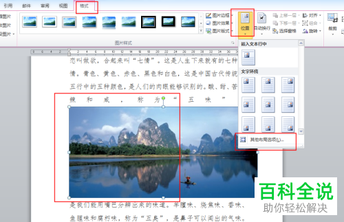 5. 第五步,我们先点击选中图片,然后点击上方的格式选项,再点击格式菜单中的位置选项,最后点击下拉菜单中的其他布局选项按钮。