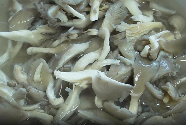 2.准备一锅开水,加一勺盐,把蘑菇放进去焯水一分钟左右,这种菌类食物焯水能减少烹饪的时间,而且能去除异味,不信你可以闻一下焯水后的蘑菇水,时间到了以后捞出来控水备用。