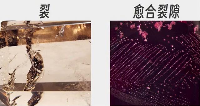 首先什么是裂,什么是愈合裂隙?裂很好理解,由于环境变化或者受应力影响产生的裂纹,那什么是愈合裂隙?我们可以简单的理解为它原本是裂,然后长好了,我们对裂和愈合裂隙做个简单形象的比喻,裂就像一颗玻璃球被摔了一下,有道裂纹在玻璃球里,而愈合裂隙就像人手被割了一下,然后长好了,你能看到有个疤但它确实已经愈合了。