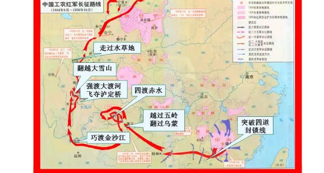 长征的简介 1934年10月,中央**(即红一方面军)开始实行战略转移后,**中央、中革军委、**总政治部在所发的指示和命令中,并没有把这次行动称为“长征”,而是称为“突围”、“反攻”、“西进”等。同年11月,**驻共产国际代表团团长王明,在莫斯科向苏联外国工人出版社中国部全体工作人员作报告时,把红7军团北上和红6军团西征称为“长征”,这是目前所知最早的“长征”概念。 长征的原因 简单地说理由有以下三点:最直接原因是第五次反“围剿”失败,次要原因是考虑重开革命新局面,主动进行战略转移,再是抗日救亡时代背景的影响。第五次反“围剿”失败的原因可归纳为一是敌人实力强大,二是我党犯了错误。 长征的基本路线 瑞金→突破敌四道防线→强渡乌江→占领遵义→四渡赤水→巧渡金沙江→强渡大渡河→飞夺泸定桥→翻雪山→过草地→陕北吴起会师(1935年10月)→甘肃会宁会师(1936年10月),宣告长征的胜利结束。 |