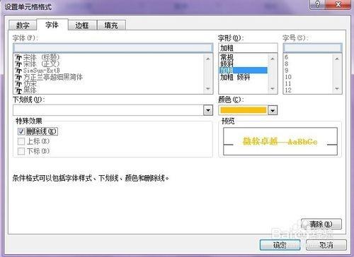 单击“设置为”右侧的箭头,从下拉列表中选择“自定义格式”命令,打开“设置单元格格式”对话框。在“字体”选项卡下依次设定字形为“加粗”,特殊效果为“删除线”,颜色为“黄色”。