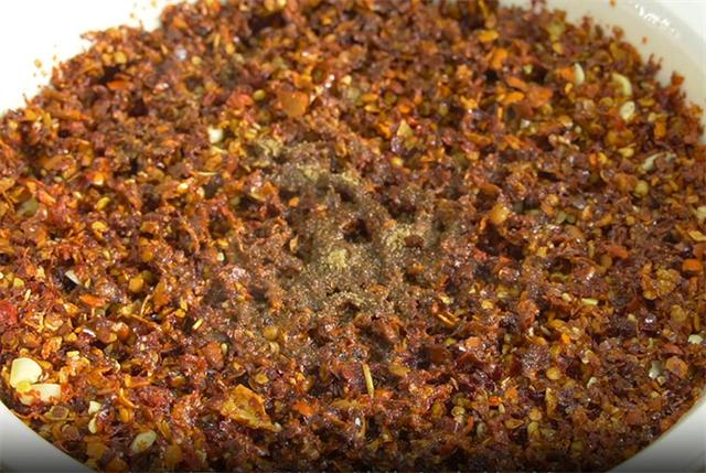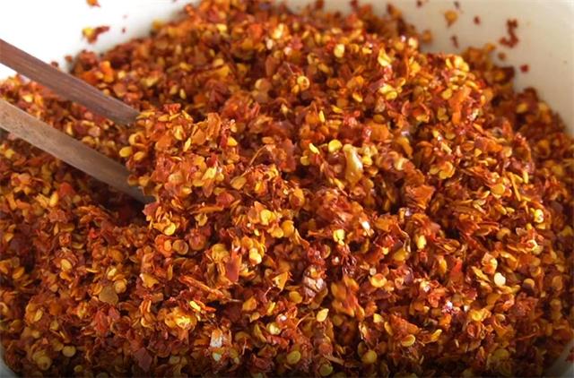7.再把炸好的辣椒油倒进去,热油要分两次倒进去,油倒进去以后水分会瞬间蒸发掉,所以不用担心辣椒里面还有水分,再把剩下的热油倒进去,现在满屋子都是又香又辣的味道。再次搅拌均匀,倒入少量的十三香,最后加一点白酒,加白酒可以增加辣椒保存的时间,而且吃起来会更香。摘自: www.ws46.com