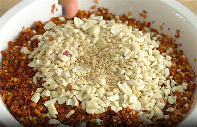 5.花生米已经放凉了,放入保鲜袋里,用擀面杖压碎,再把它敲碎一点,然后倒在辣椒里面,再加入30克芝麻搅拌均匀。