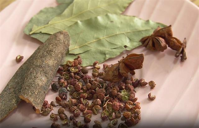 4.接下来我们在盘子里放入几片香叶,一个八角,一小把花椒,两根桂皮,这就是咱们所需要的配料,把它们放一边备用。